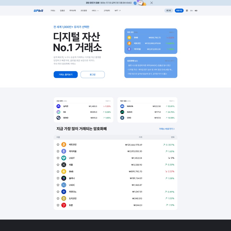 국내 1위 암호화폐 거래소 업비트의 웹사이트가 너무 많은 정보와 복잡한 UI로 인해 초보자들이 사용하기 어려운 문제를 발견했습니다. 다양한 정보가 한 화면에 몰려있어 혼란스러운 인터페이스를 간소화하고, 정리된 UI를 반응형으로 구현하여 접근성까지 확보한 프로젝트입니다.