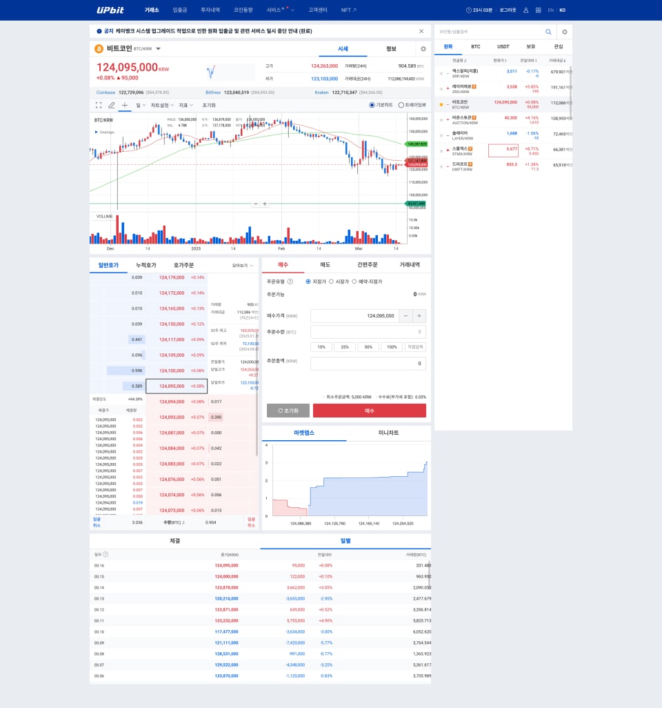 업비트 웹사이트는 한 화면에 과도한 정보가 집중되어 있어 초보 사용자들이 "뭘 봐야 할지 모르겠다"며 복잡함을 느끼고, 이는 접근성을 저해할 수 있습니다.