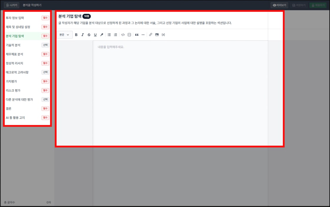 기존 보고서 작성 페이지는 작성 가이드나 튜토리얼 없이 사용자가 모든 내용을 직접 작성해야 했지만, AI 기능을 추가하여 사용자가 선택한 종목에 맞는 분석 키워드를 추출하고, 작성 과정의 복잡성을 줄였습니다.