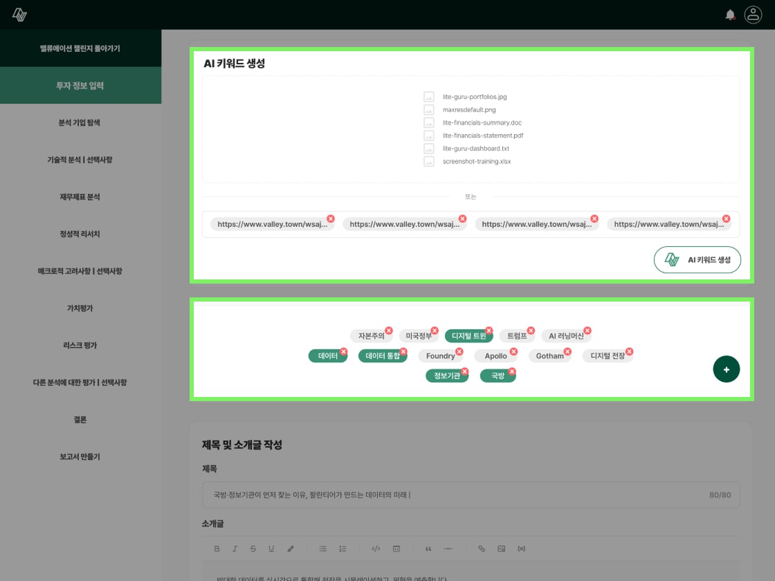 AI 기능을 통해 선택한 종목에 적합한 키워드를 자동 추출하여 사용자의 보고서 작성 부담을 완화했습니다.