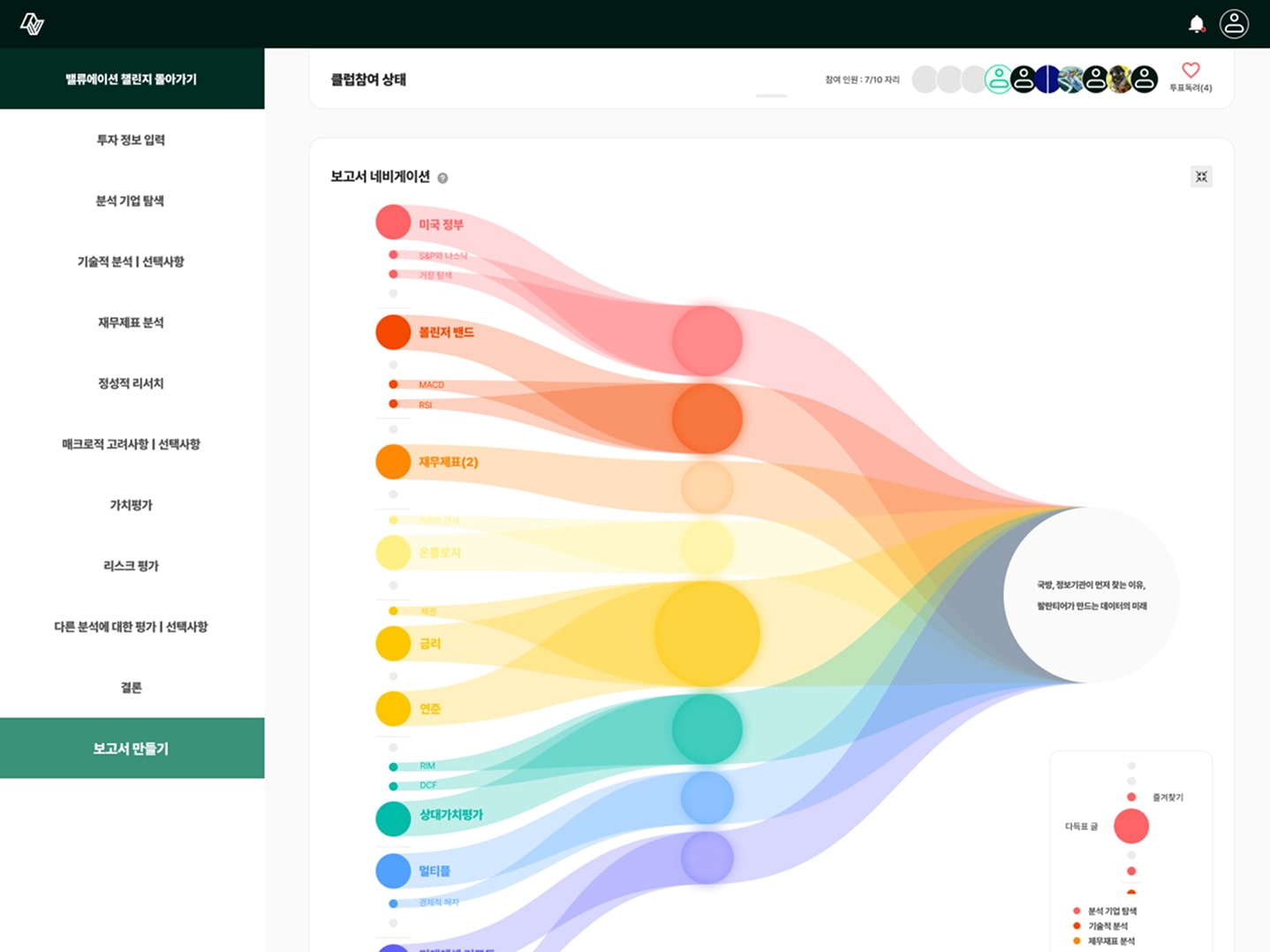 비슷한 투자 관심사나 분석 목표를 가진 사용자들이 서로 연결되어 팀을 구성하고, 함께 보고서를 작성할 수 있는 협업 환경을 설계했습니다.