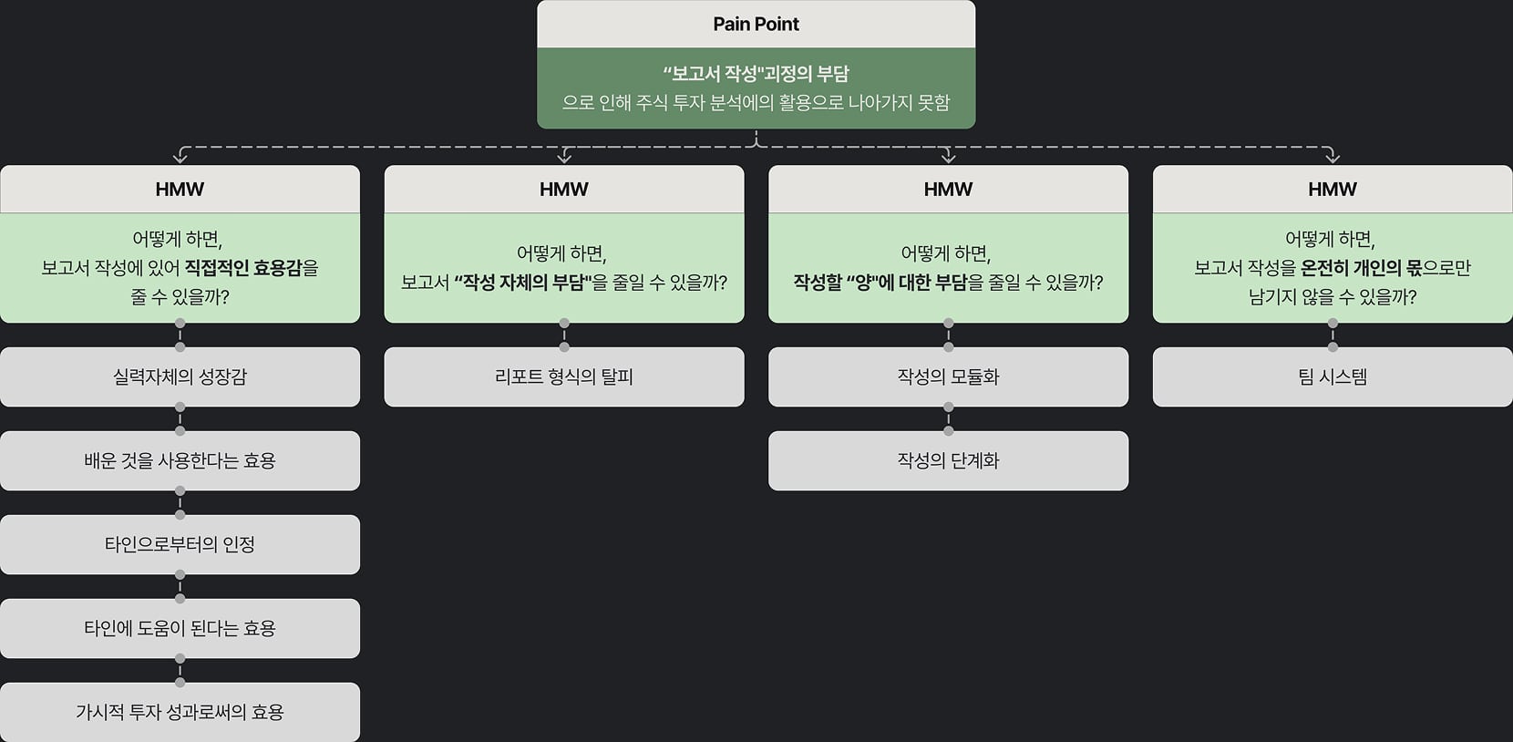 위에서 도출한 사용자가 보고서 작성 시 느끼는 각 문제들의 해결을 위해 BrainStorm과 HMW를 도출했습니다.