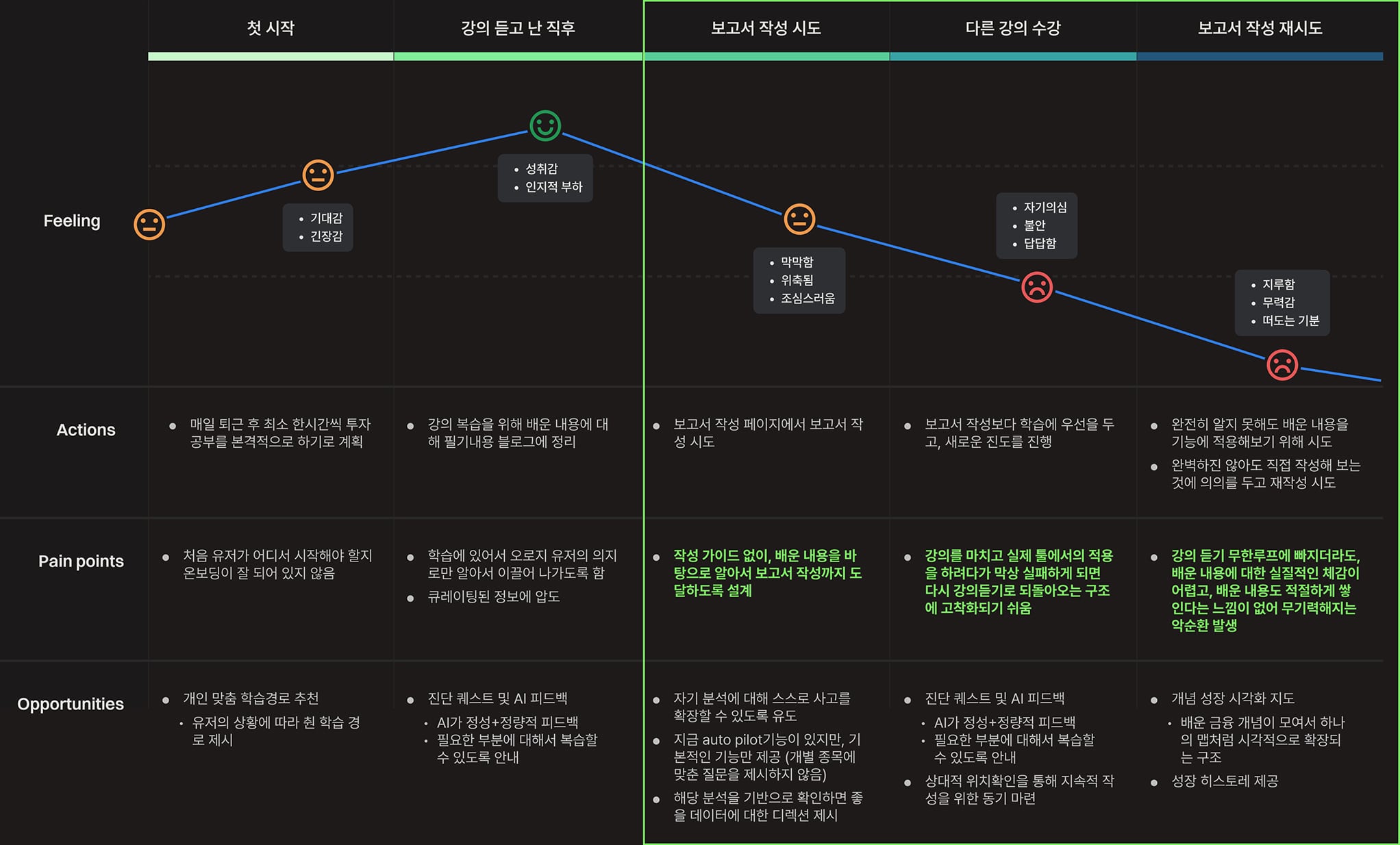 이러한 분석을 통해 사용자들이 보고서 작성 과정에서 겪는 심리적 장벽을 해소하고, 학습 내용을 실제 투자 분석으로 연결할 수 있도록 지원하는 솔루션이 필요하다고 정의했습니다.
