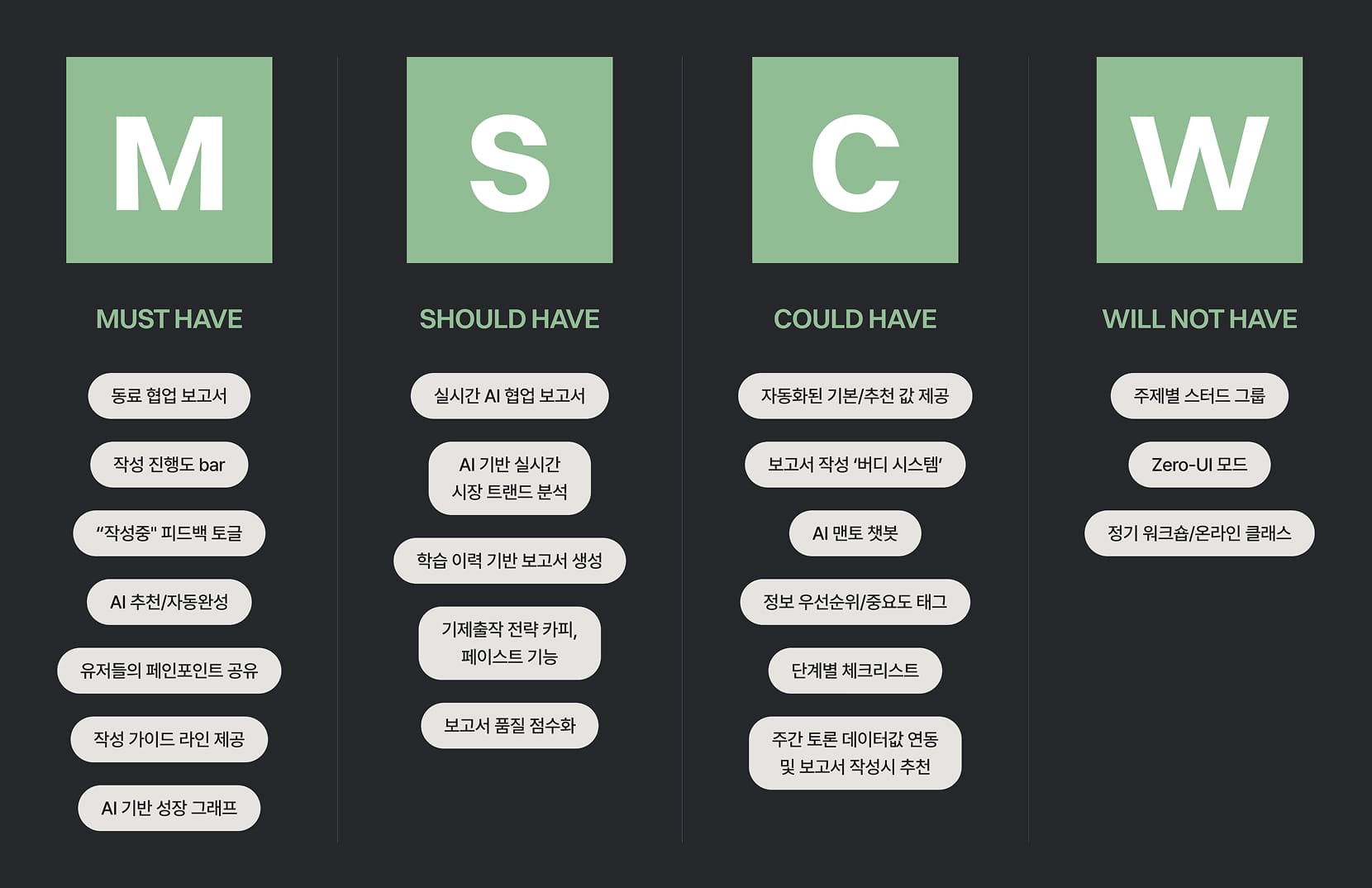 • 논리적 오류나 데이터 실수를 바로잡아 줄 AI와 멘토의 실시간 피드백이 필요해요.