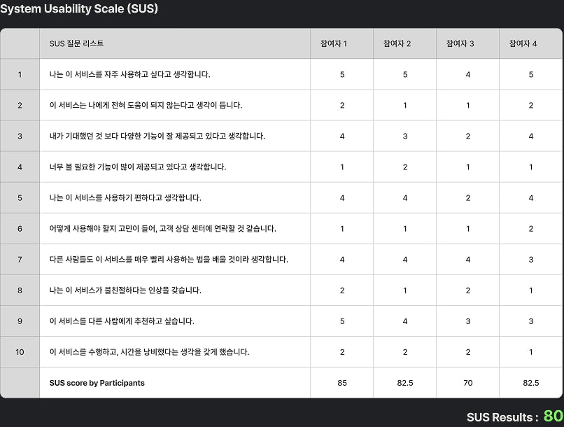 참가자들의 전반적인 피드백은 혼자 작성하던 보고서를 팀원과 함께 완성하는 경험이 동기 부여와 효능감을 높이는 데 효과적이라는 것이었습니다. 특히 AI 기반 키워드 가이드의 편리함과 더불어, 개인의 기여도 및 보고서 전체 흐름을 한눈에 보여주는 시각화 기능이 매우 직관적이라는 점에서 높은 평가를 받았습니다. 정성적 피드백과 함께 SUS(System Usability Scale) 평가도 병행하여 정량적 지표를 확보했습니다.